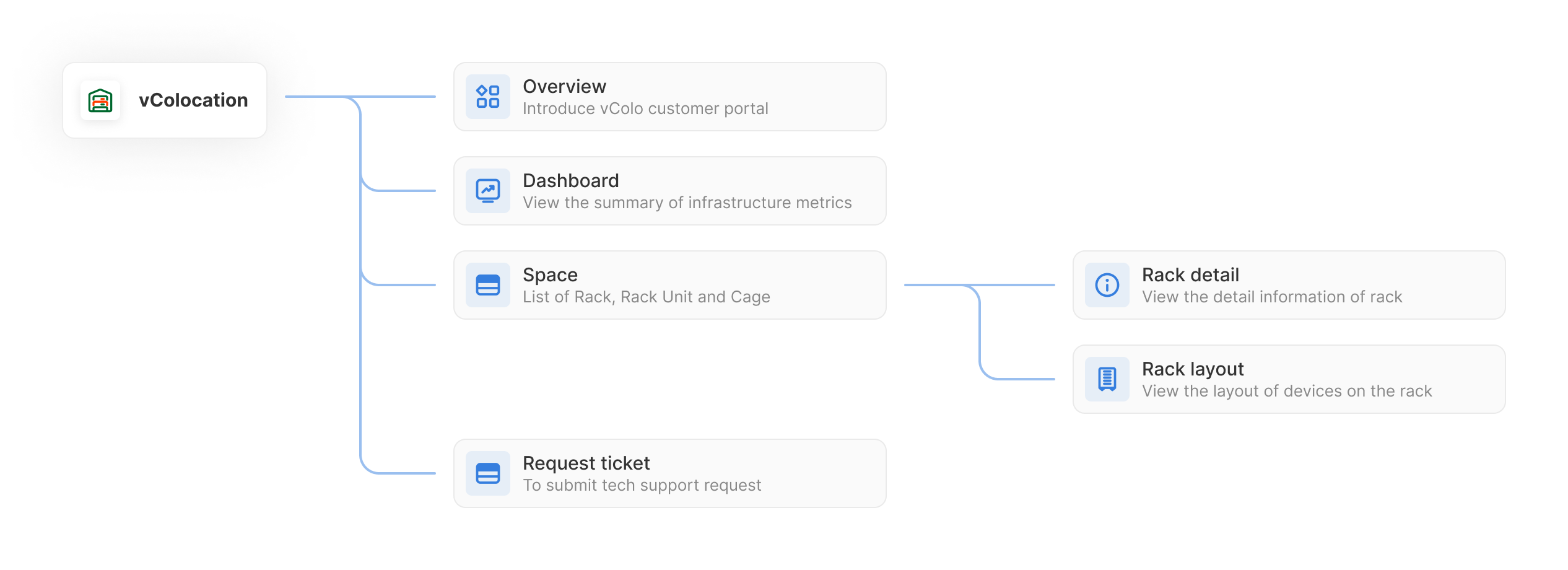 <table data-header-hidden><thead><tr><th width="140"></th><th width="403"></th><th></th><th></th></tr></thead><tbody><tr><td><strong>Feature</strong></td><td><strong>Description</strong></td><td><strong>Status</strong></td><td><strong>Release date</strong></td></tr><tr><td>OVERVIEW</td><td>Introduction about vColo customer portal</td><td><strong>Released</strong></td><td>06/2023</td></tr><tr><td><a href="https://vngctech.atlassian.net/wiki/spaces/VCPUG/pages/878673926">DASHBOARD</a></td><td>Statistical data and system status overview, including parameters such as power consumption, temperature, humidity, rack space usage status, and other statistics.</td><td><strong>Released</strong></td><td>06/2023</td></tr><tr><td><a href="https://vngctech.atlassian.net/wiki/spaces/VCPUG/pages/878477322">SPACE LIST</a></td><td>List of rented spaces, including the list of racks, rack units, and cages that the user is currently renting.</td><td><strong>Released</strong></td><td>06/2023</td></tr><tr><td><a href="https://vngctech.atlassian.net/wiki/spaces/VCPUG/pages/878542922">RACK DETAIL</a></td><td>Detailed rack information, displaying the history of fluctuations in power consumption, temperature, and humidity, along with detailed technical specifications of the rack.</td><td><strong>Released</strong></td><td>06/2023</td></tr><tr><td><a href="https://vngctech.atlassian.net/wiki/spaces/VCPUG/pages/879001601">RACK LAYOUT</a></td><td>Rack equipment layout diagram, allowing to view the installation location of devices on the rack, and some general information about the rack such as the number of devices currently installed on the rack, statistics on the weight of the devices, and the operating power level of the rack.</td><td><strong>Released</strong></td><td>06/2023</td></tr><tr><td><a href="https://vngctech.atlassian.net/wiki/spaces/VCPUG/pages/882147377">TICKET REQUEST</a></td><td>This is the link to redirect to the customer request management system</td><td><strong>Released</strong></td><td>06/2023</td></tr><tr><td>CONNECTION CIRCUIT</td><td>N/A</td><td><strong>Developing</strong></td><td>12/2023</td></tr><tr><td>REPORTING</td><td>N/A</td><td><strong>Developing</strong></td><td>12/2023</td></tr></tbody></table>