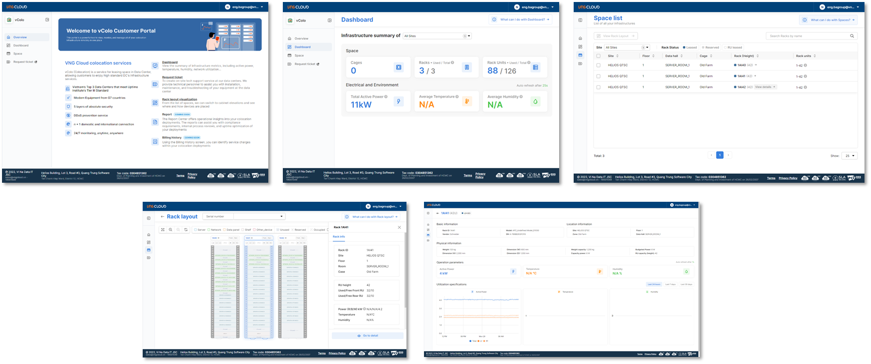 The vColo Customer Portal is an automated data center space rental management platform provided by GreenNode. It offers an intuitive and convenient interface for customers to manage and monitor their resources, including power usage, environmental parameters, equipment layout diagrams, equipment lists, assets, and more.