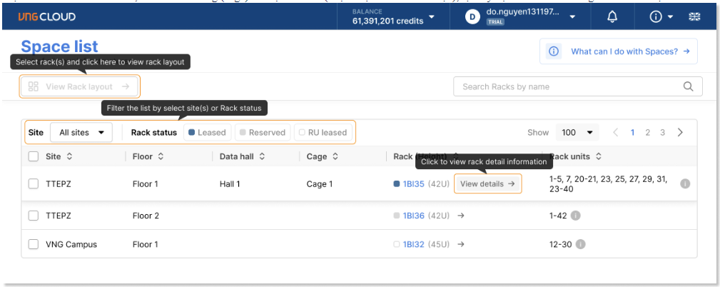 List all racks, rack units and cages that you have rented (or reserved for you). Here you can view detailed information or view the layout of equipment placed in the racks.