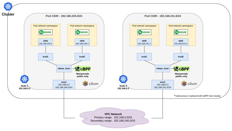 * **Cilium** and **eBPF** perform network management for all pods on each node, including handling traffic going from pod to pod, or from node to node. When necessary, eBPF performs **masquerading** to hide the internal IP address of the pod when communicating with the external network.