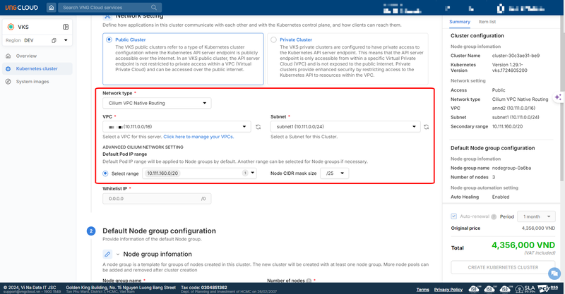**Step 4:** At the Cluster initialization screen, we have set up the information for the Cluster and a **Default Node Group** for you. To use **CNI Cilium VPC Native Routing** for your **Cluster** , please select: