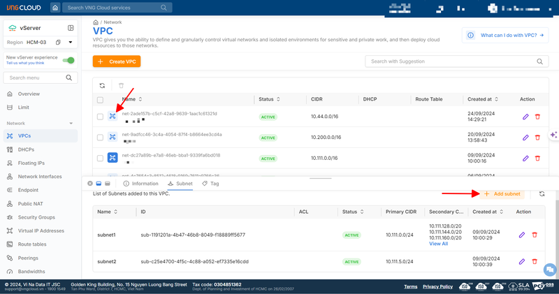 * **Step 4**: After having at least 1 VPC, to create a subnet, you need to select **View Detail** to expand the control panel at the bottom, including the **Subnet** section.