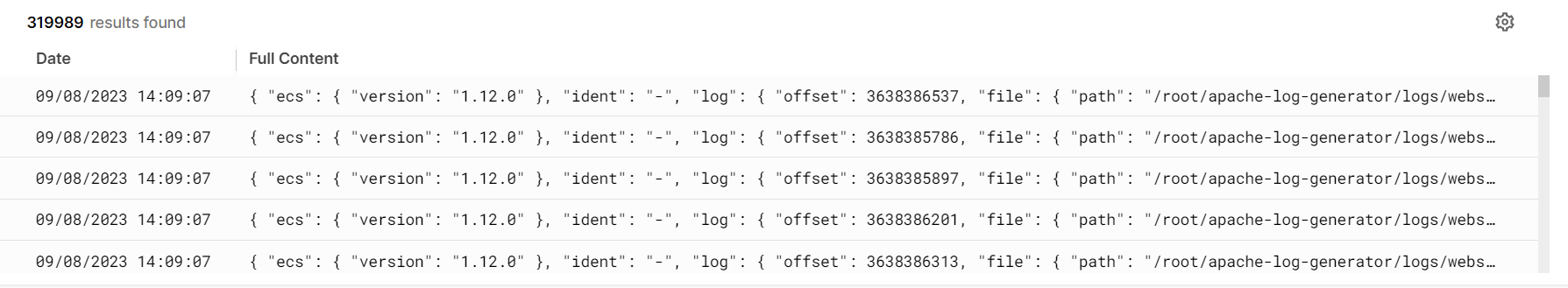 **By default, log data is displayed in Full content view**. If you only want to display a certain number of log fields on the chart, select the log fields at