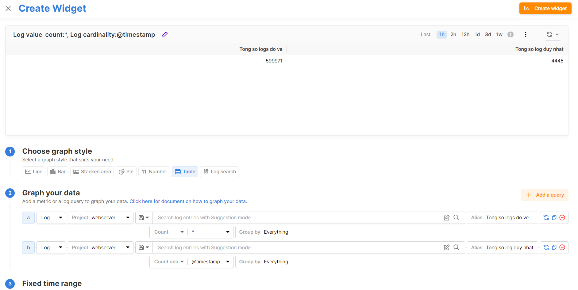 Fixed time range is an attribute of a Widget that you can configure to filter data on the Widget according to a fixed time range, independent of the Dashboard's time range. Each Widget can have its own Fixed time range setting, and you can choose from the time ranges described in the table below. For instance, if you select Global time, the data retrieval period displayed on the Widget will match the time range you selected on the Dashboard. This means that changing the data retrieval time on the Dashboard will also change the Widget's data retrieval time. It is recommended to use this option. If you choose Pass N minutes (N = 5,10,...), the data retrieval period on the Widget will be fixed (unchanged) and will always be 5, 10,... minutes ago.
