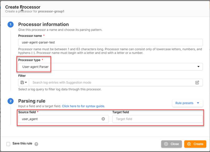 * After the parsing rule has been stored, in subsequent processor creations you can reuse this rule by selecting **Rule presets** in the Pasing rule section.