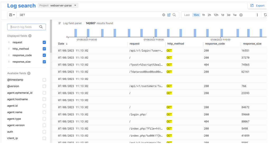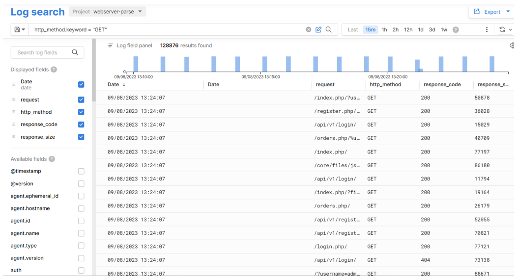 For example, to filter log records with HTTP method GET within the last 15 minutes, select query as http\_method.keyword = 'GET' and set time range to 15m..