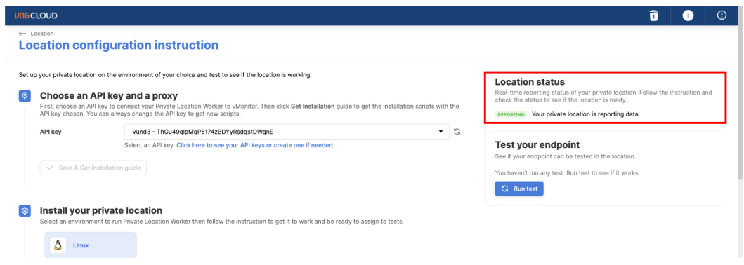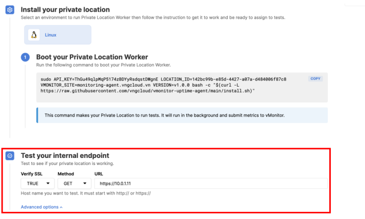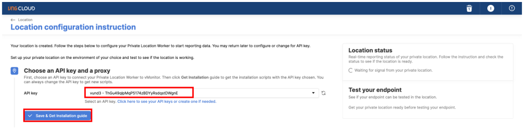 Next step select API Key to have authentication information between Private Location and GreenNode and select Save & Get Installation Guide so that the system will generate the necessary configurations and commands for you to install.