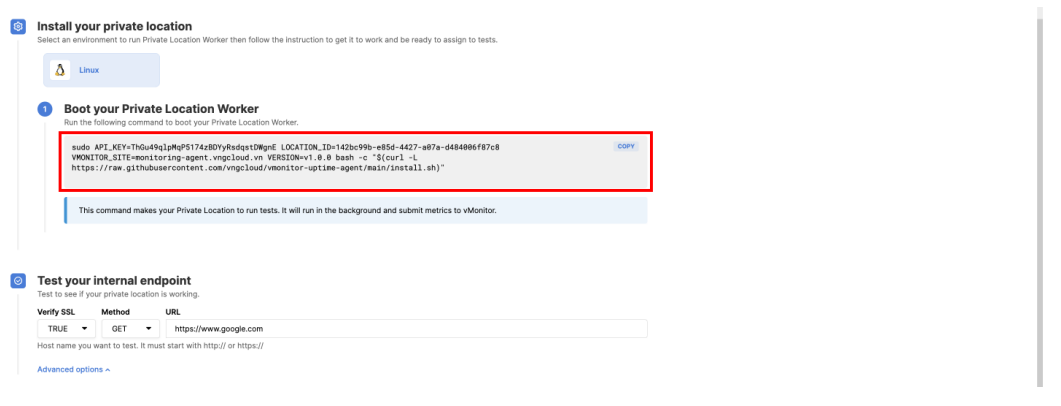 6. The system will generate a command for you to install Synthetic Worker on Private Location, you just need to copy the command and install