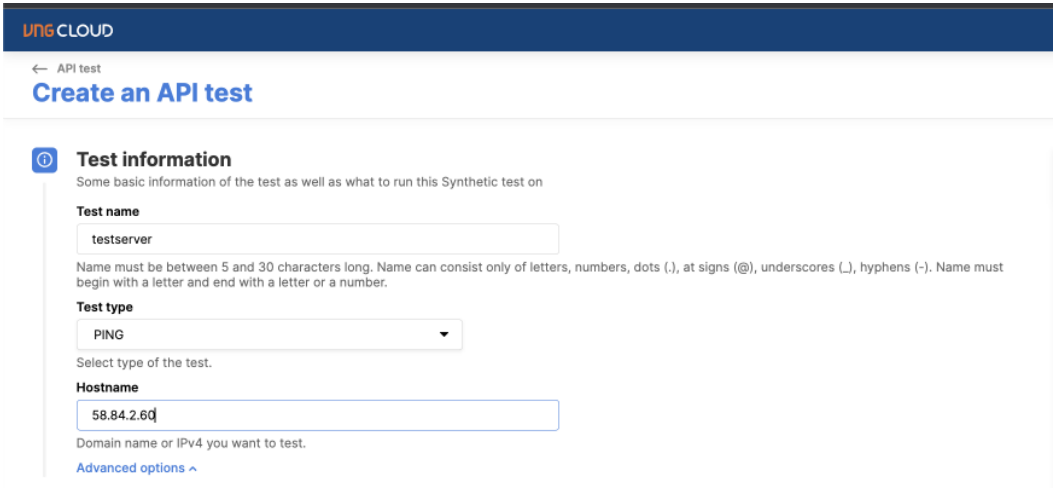 Test Information: define basic information, select Ping method and specify hostname to test