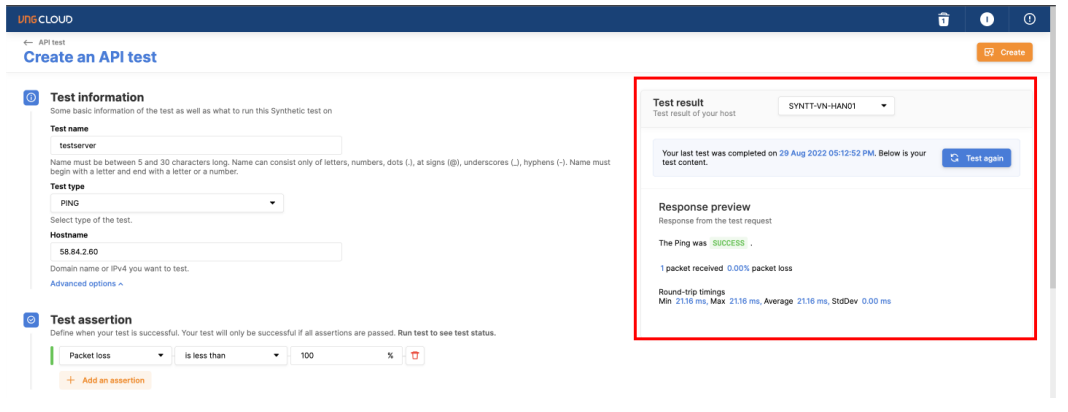 After filling in the Test Information, you can choose Run Test or Test Again if you have tested before to check, you can see returned information such as whether Ping was successful or not, packet loss rate or packet latency.