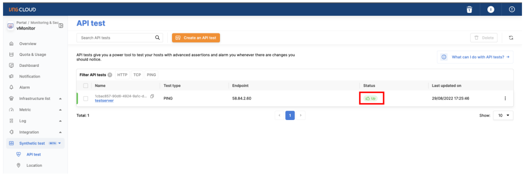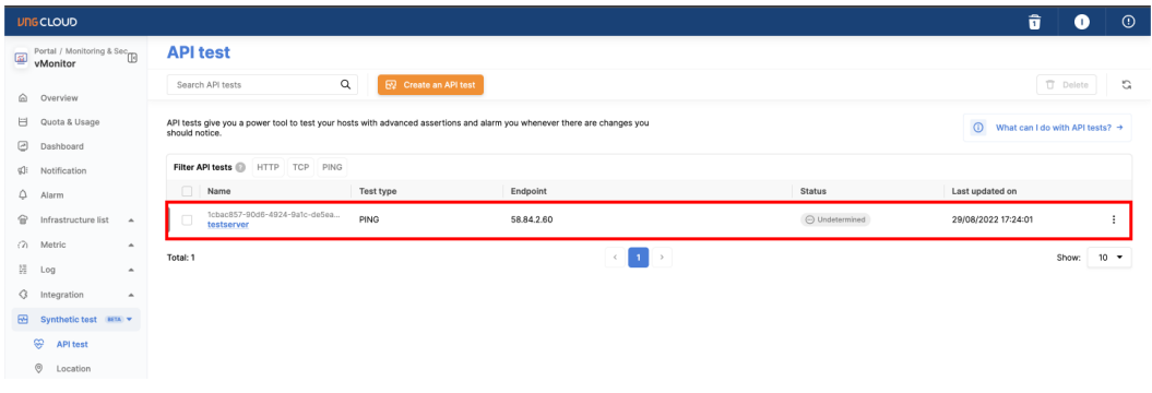 6. Then press the " Create " button to initialize the API test. After creating, you will see the API test is in Undertermine state, until the next inteval the Test API will be updated to the correct state.