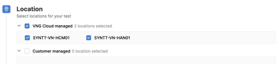 Select the Location that will run Ping Tests to your hostname. Ping tests can be run from both Public Locations (managed by GreenNode) and Private Locations (installed and managed by customers) based on your needs for running tests from outside (internet) or inside the network. your. Public Locations managed by GreenNode currently has 2 locations: HCM and Hanoi.