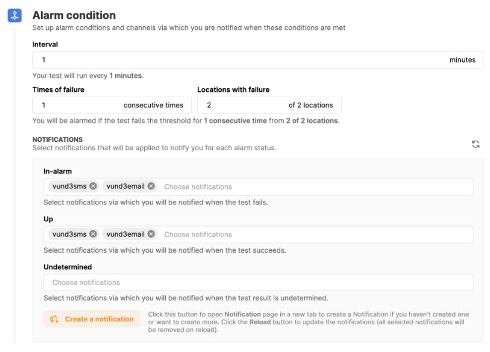 For example, when you select Time of failure: 1 and Locations with failure: 2, it will be understood as: you will be warned if the Test fails 1 time in a row from 2 out of 2 locations.