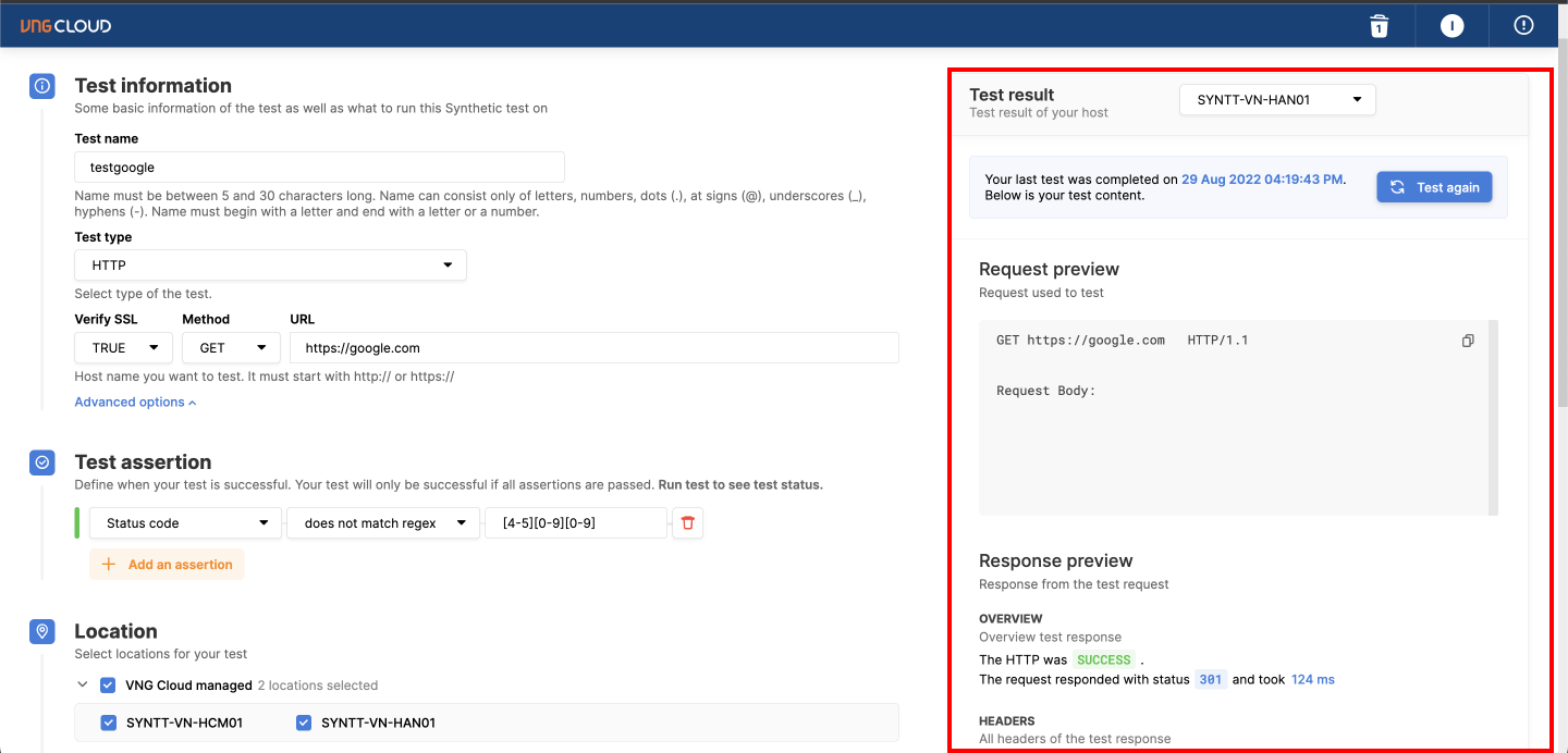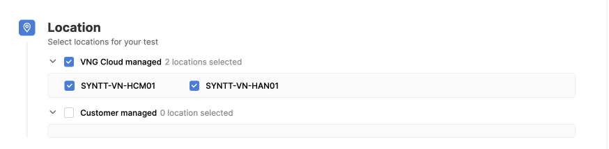 * Select a Location to run HTTP Tests to your URL. HTTP tests can be executed from both Public Locations (managed by GreenNode) and Private Locations (self-installed and managed by customers) based on your need to run tests from outside (internet) or inside your network. Public Locations managed by GreenNode currently include two locations: HCM and HN.