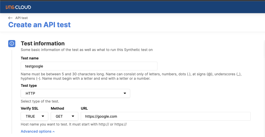 * **Test Information**: define the basic information, choose the HTTP method, and specify the URL to be tested