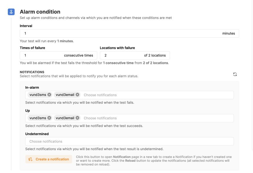 For example, when you select Time of failure: 1 and Locations with failure: 2, it means you will be alerted if a test fails once consecutively in 2 out of 2 locations.