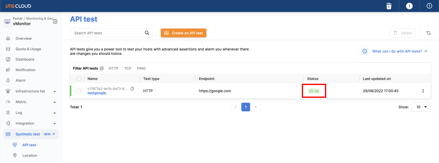 * The API Test has changed to the Up status when the URL is functioning normally.