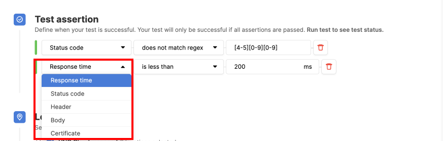 * Assertions define what you expect from the API Test results. If the returned results match your definition, the API Test will indicate that the URL being tested is successful; otherwise, it will indicate failure. The system will automatically add an assertion for the status code after you run the test; you need to define at least one assertion for the API test. In addition to the status code assertion automatically added by the system, you can add any other assertions we support, such as Response Time, Header, Body, and Certificate.