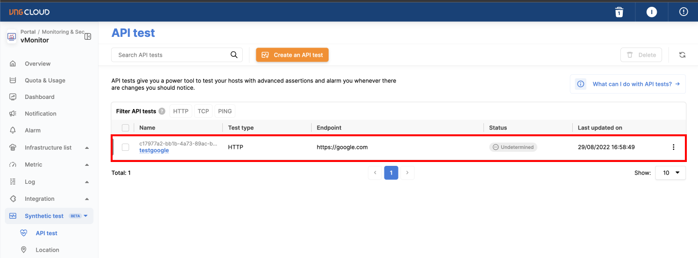 6. Then click the "**Create**" button to create an API test. Once created, you will see the API test in an Undetermined state. The status will be updated accurately in the next interval.