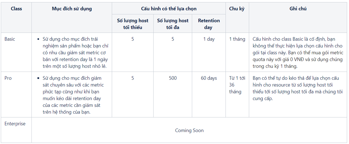 vMonitor Platform offers 3 classes for the Metric Quota package: Basic, Pro, and Enterprise (Coming soon). Refer to the table below to choose the appropriate class.
