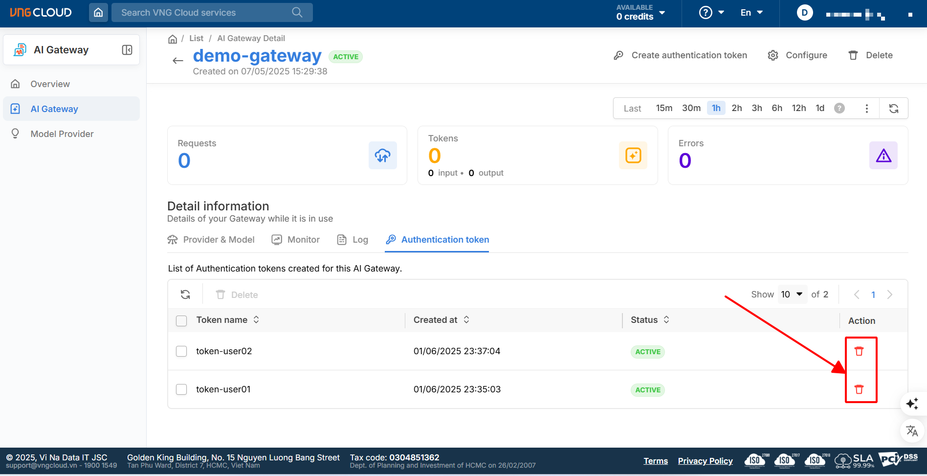 Token sau khi xoá sẽ không thể sử dụng lại được để xác thực các truy cập vào AI Gateway.