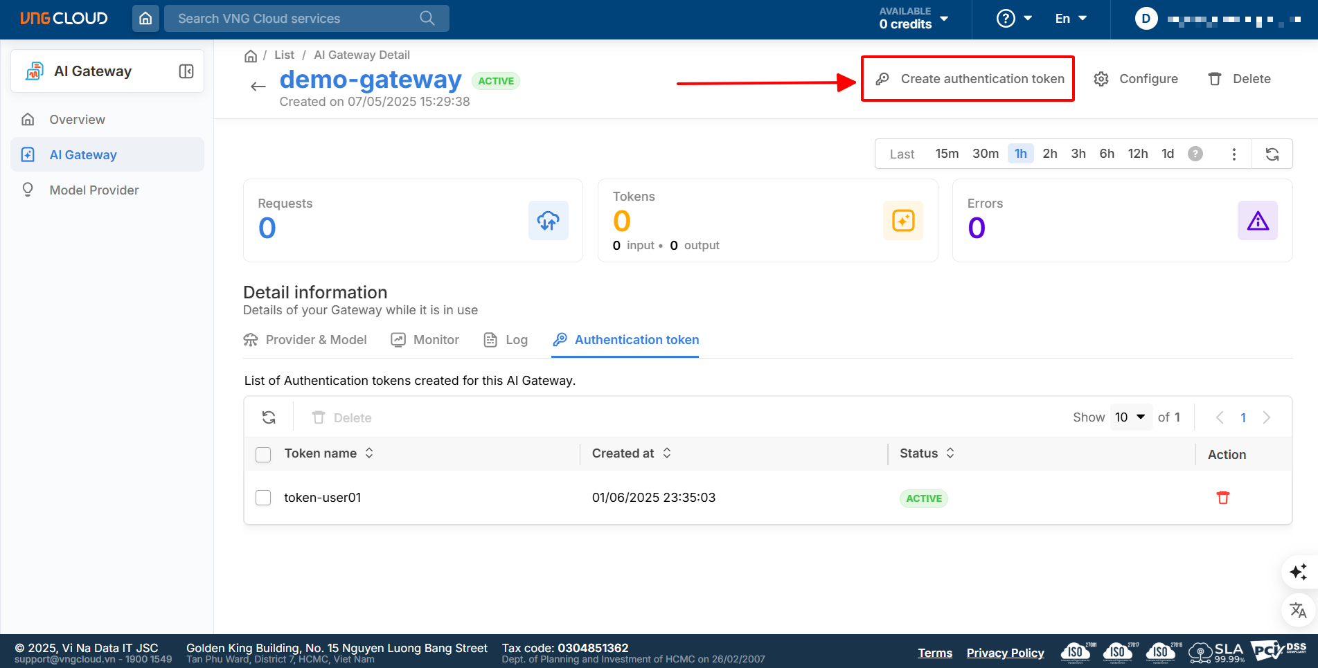 1. Truy cập tab **Authentication token** trong giao diện quản lý AI Gateway.