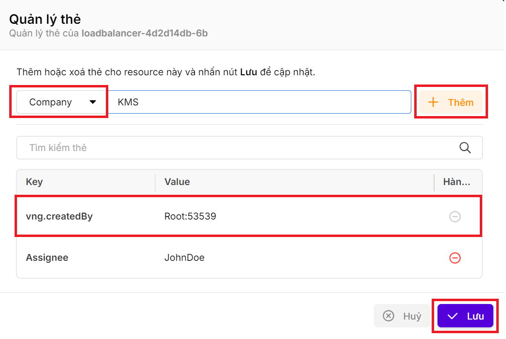 * **Nhập giá trị:** Nhập giá trị cụ thể cho tag đó (ví dụ: `Assignee=Sultu`, `Department=Engineering`). Nhấn nút "Thêm" để xác nhận thêm tag
