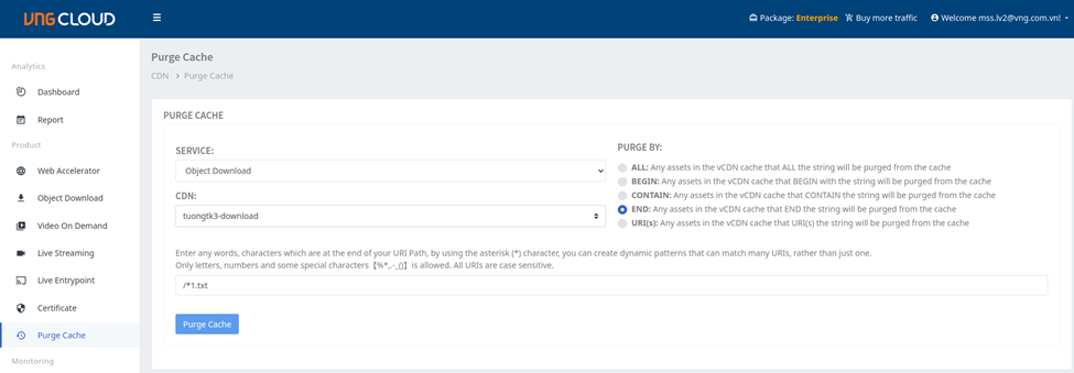 Purge by END: Sẽ xóa hết các resource đang được Cache ở vCDN kết thúc chuỗi ký tự nhập vào.