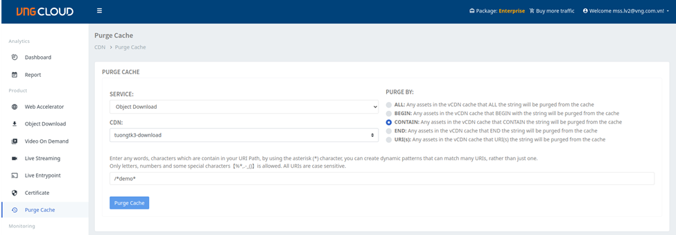 * Tương tự như Purge by ALL, trước khi Purge Cache các file đã được Cache ở CDN. Tiến hành Purge Cache: Chọn **Service** và **CDN** tương ứng và **Purge by CONTAIN**. Tại URI nhập: `/*demo*` (xóa cache tất cả các file \*demo\* đang được cache ở vCDN).