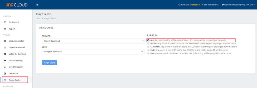 * Tiến hành Purge Cache: Chọn **Service** và **CDN** tương ứng và **Purge by ALL**