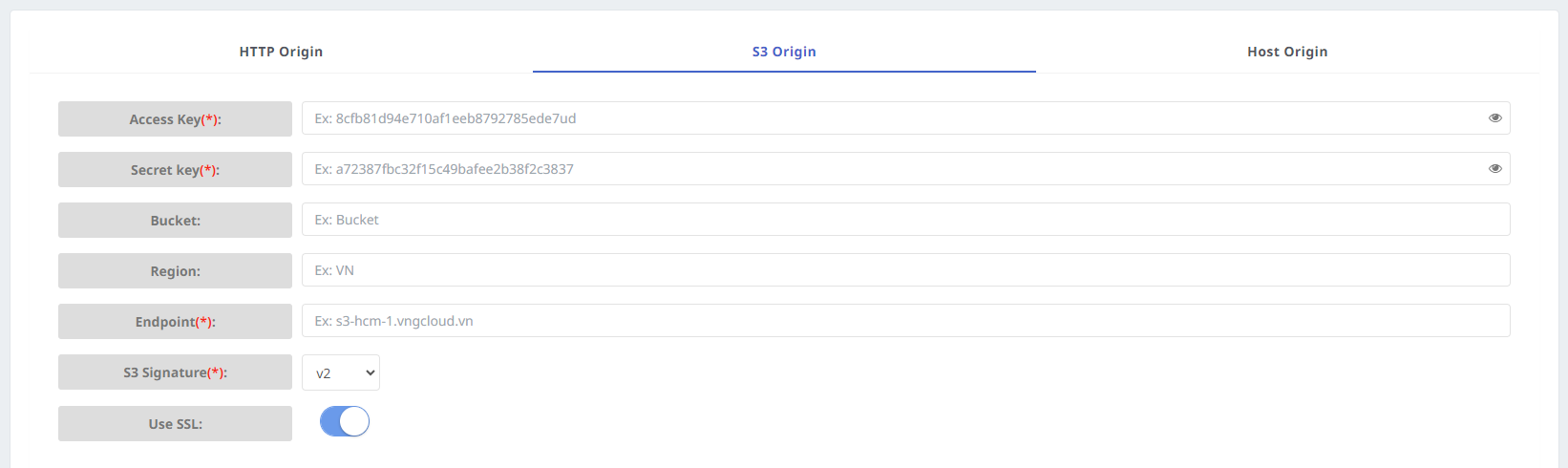 Hiện tại, vCDN đang hỗ trợ bạn kết nối trực tiếp đến origin là Object Storage thuộc chuẩn S3-compatible. Để thực hiện kết nối, bạn cần nhập các thông tin, bao gồm: