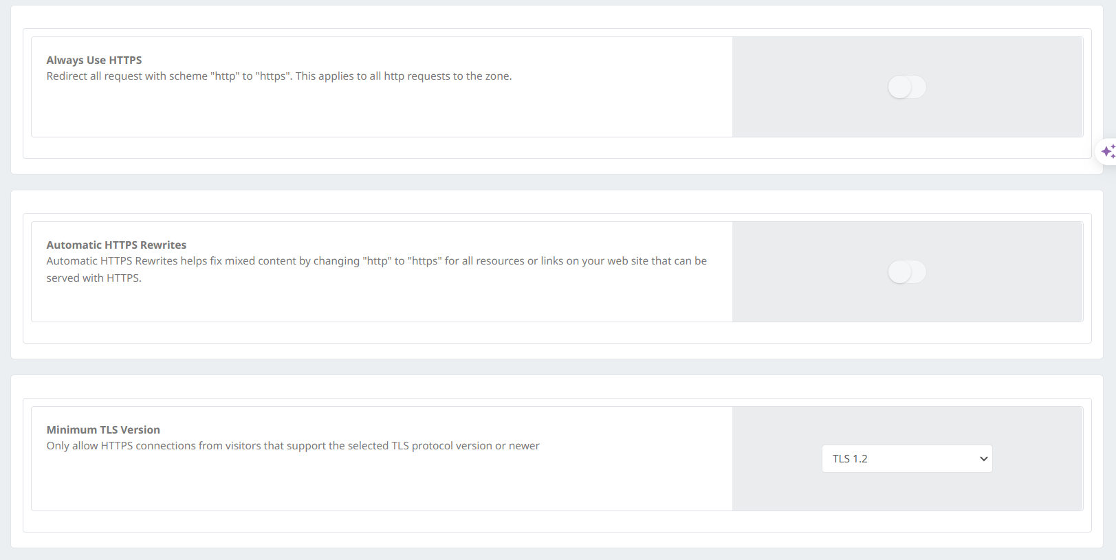 * **Minimum TLS Version**: Nếu website của bạn đang sử dụng giao thức HTTP và trong quá trình chuyển đổi sang HTTPS, trình duyệt sẽ cảnh báo khi trong website còn chứa các link HTTP. Tùy chọn này sẽ giúp thay thế tự động toàn bộ link HTTP thành HTTPS.