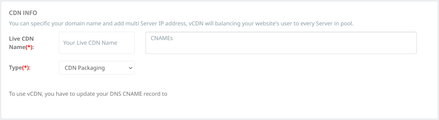 * **Type**: Lựa chọn loại dịch vụ CDN cho Live Streaming. Bạn có thể lựa chọn: