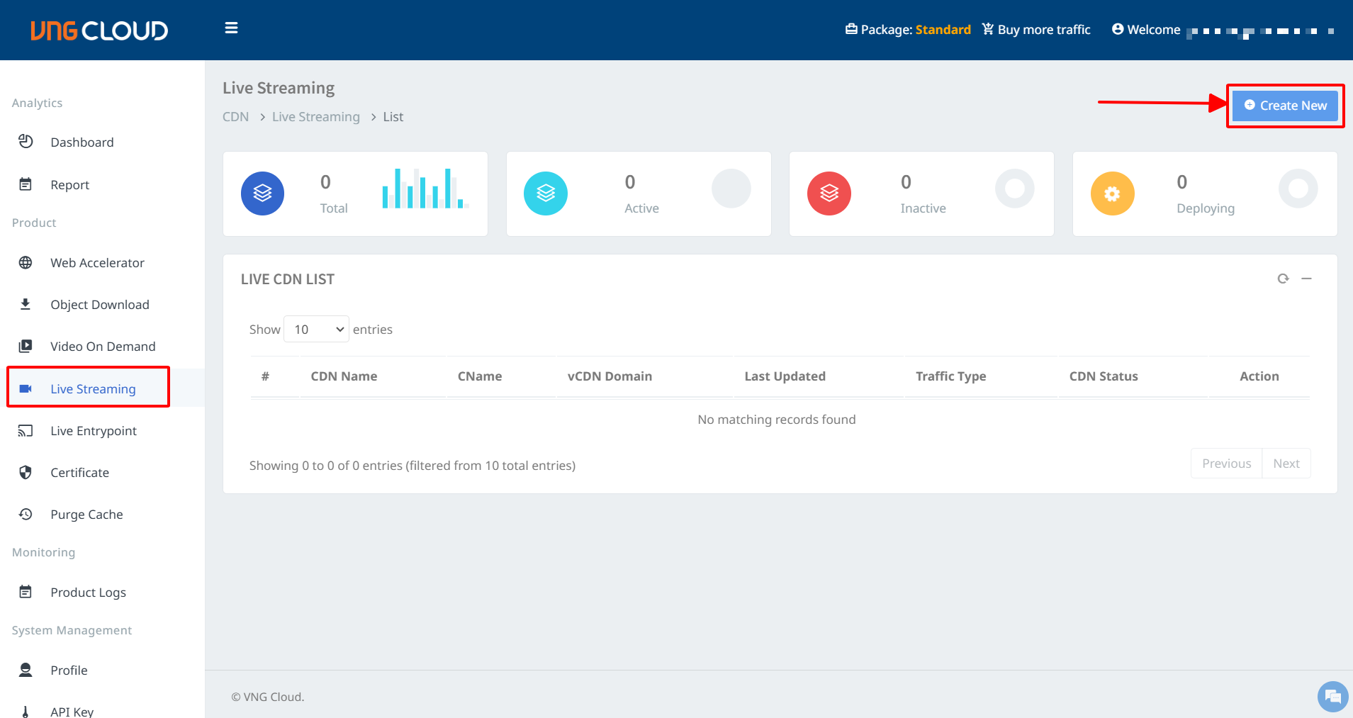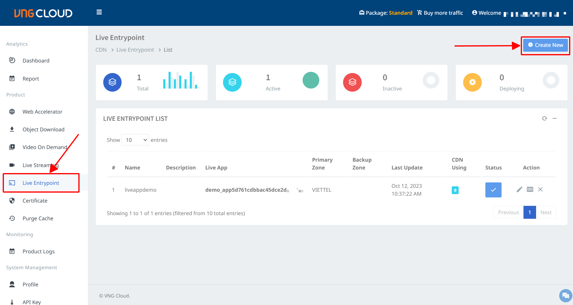 1. Truy cập vào vCDN Portal tại [https://vcdn.vngcloud.vn](https://vcdn.vngcloud.vn/live-entrypoint/list.html)