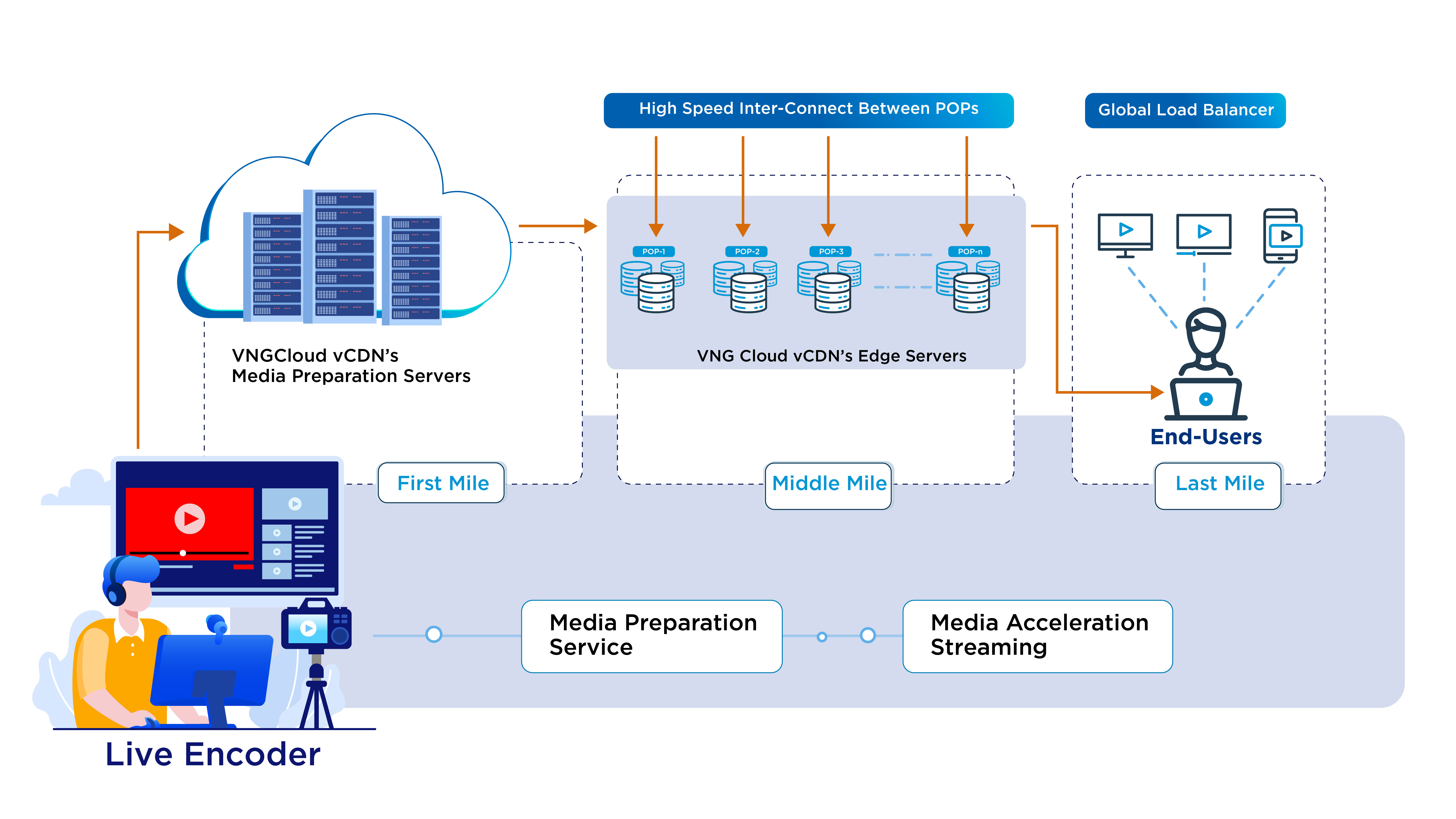 Sử dụng phương pháp [PU](https://docs.vngcloud.vn/vng-cloud-document/vn/vcdn/tong-quan/kien-truc-tong-quan/co-che-phan-phoi-du-lieu/phuong-phap-pull)[LL](https://docs.vngcloud.vn/display/ONVINA/Live+Streaming#_Ph%C6%B0%C6%A1ng_ph%C3%A1p_PULL), [PUS](https://docs.vngcloud.vn/vng-cloud-document/vn/vcdn/tong-quan/kien-truc-tong-quan/co-che-phan-phoi-du-lieu/phuong-phap-push)[H](https://docs.vngcloud.vn/pages/viewpage.action?pageId=36045441) chọn tín hiệu đầu vào và tín hiệu đầu ra, đảm bào đường truyền tốt nhất, ổn định nhất, nhiều điểm truy cấp nhất cho dịch vụ live.