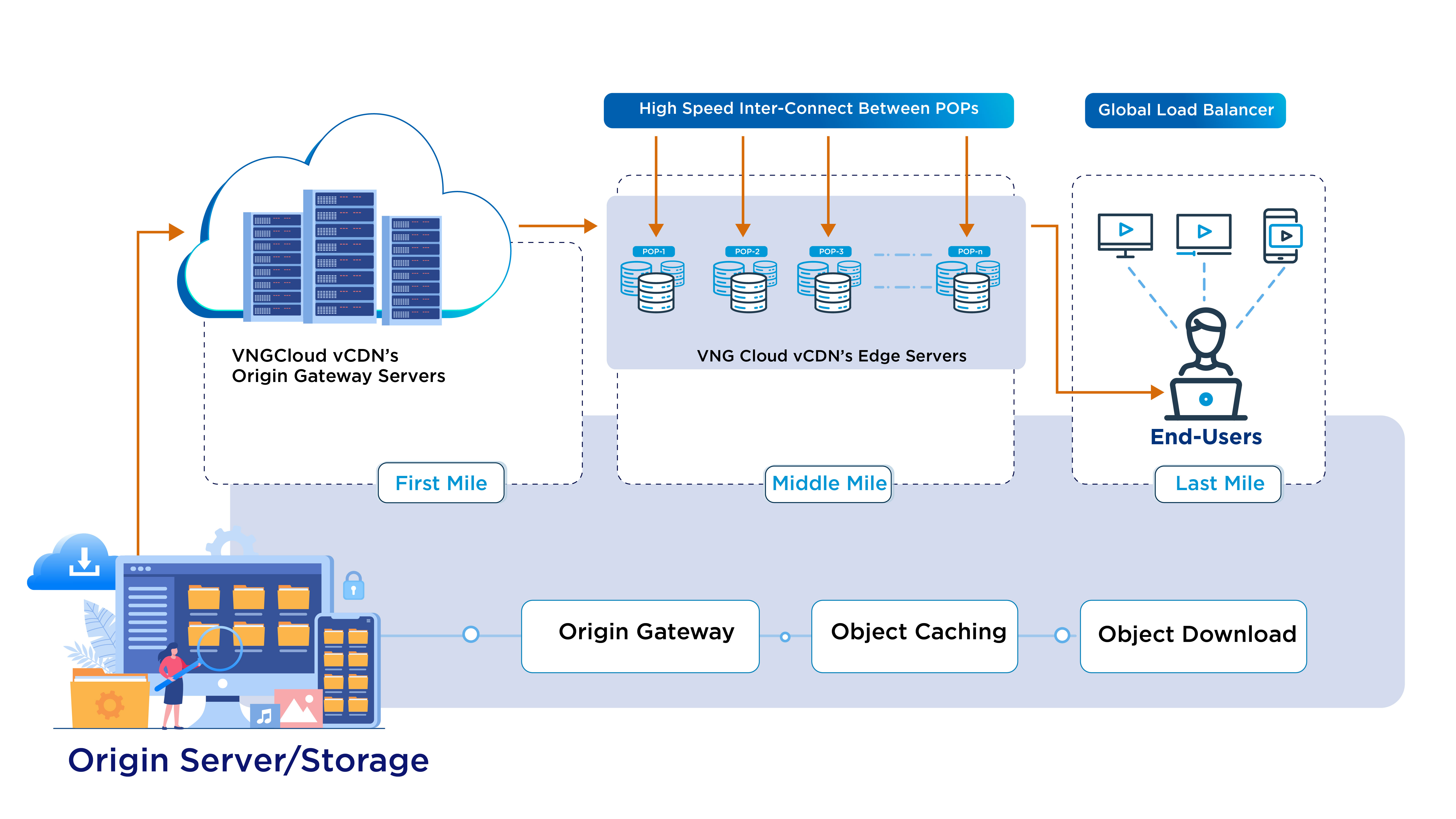 * **Hỗ trợ kết nối trực tiếp đến Origin:** Hệ thống vCDN hỗ trợ kết nối trực tiếp đến các nguồn dữ liệu dạng Object Storage sử dụng chuẩn giao thức S3-compatible. Điều này giúp khách hàng dễ dàng tích hợp dữ liệu từ các dịch vụ lưu trữ đám mây phổ biến hoặc từ vStorage.