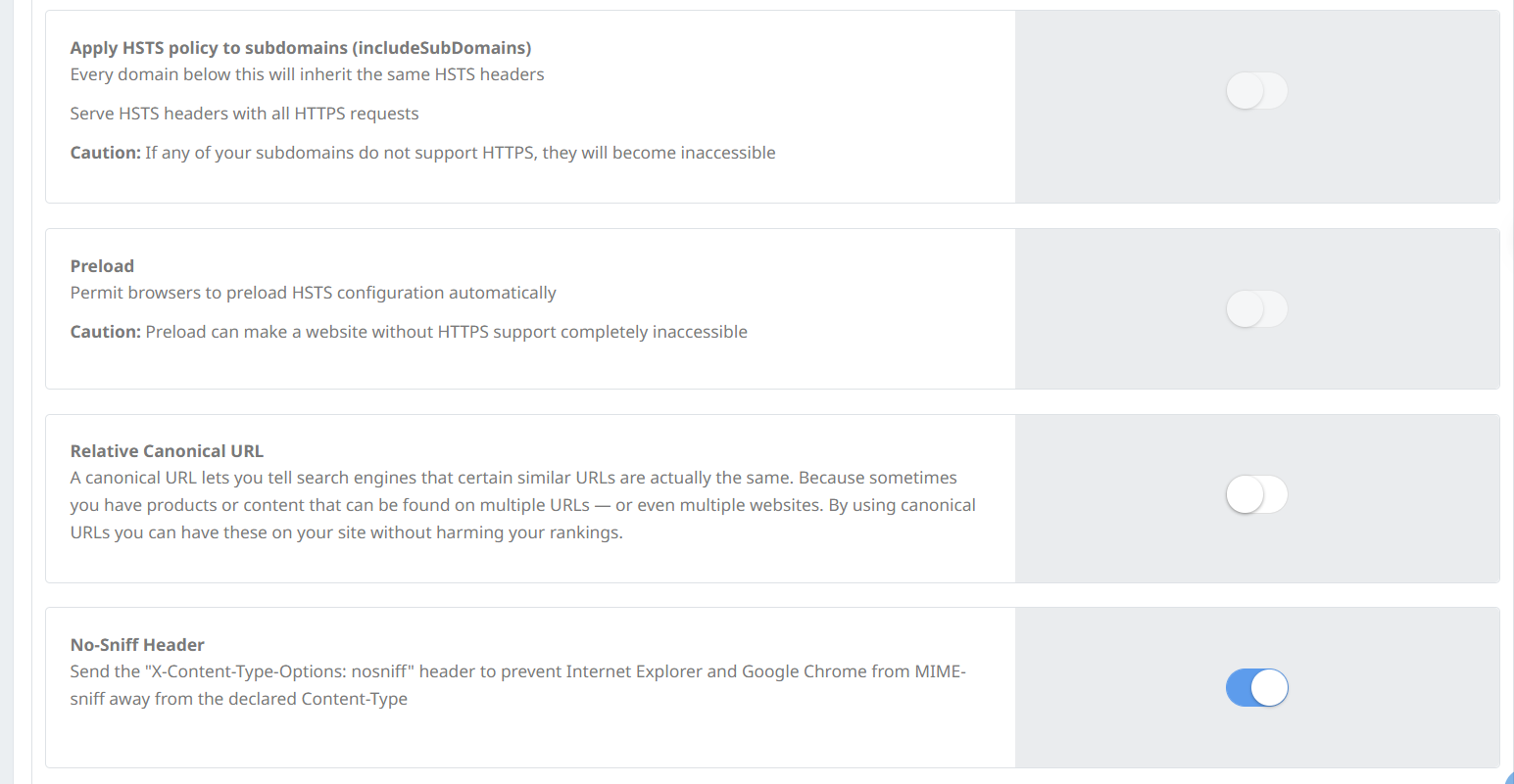 * **HTTP Strict Transport Security (HSTS)**: Áp dụng chính sách bảo mật web cho trang web của bạn, gửi các header HSTS với tất cả các request HTTPS. Nếu cấu hình sai, HSTS có thể làm cho trang web của bạn không thể truy cập được trong một thời gian dài.