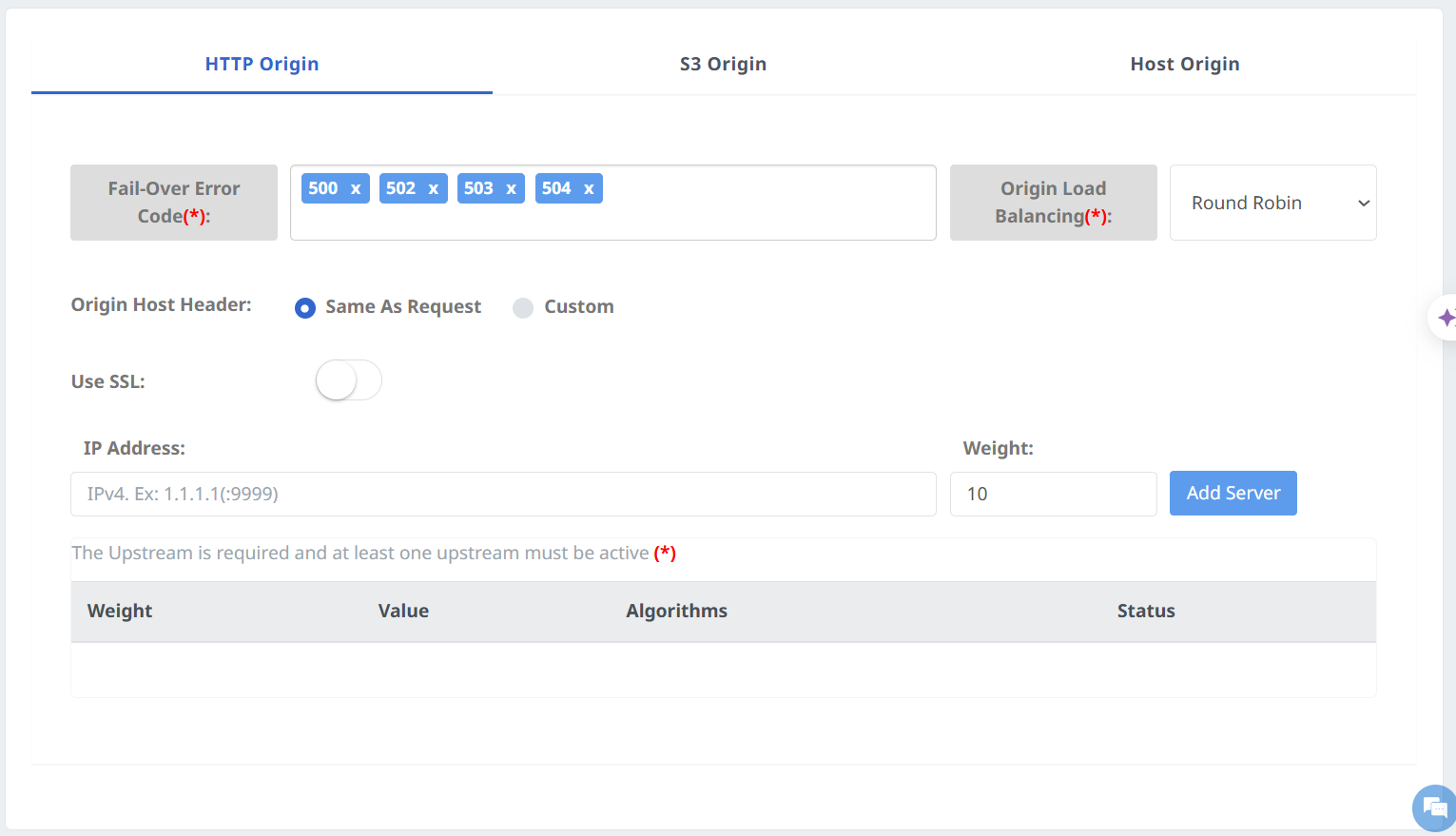 * **Fail-Over Error Code:** Danh sách các mã lỗi HTTP (ví dụ: 500, 502, 503, 504) mà nếu xảy ra sẽ kích hoạt chuyển đổi dự phòng (fail-over) đến Origin khác.