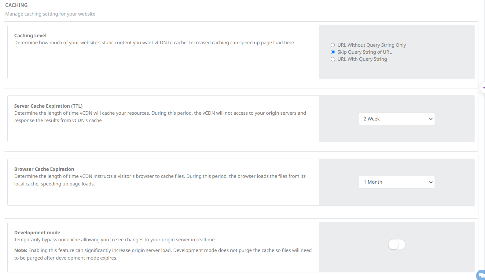 * **Development mode:** Chế độ nhà phát triển. Tính năng này cho phép tạm thời tắt caching tại Edge Server để hỗ trợ giai đoạn thử nghiệm hoặc kiểm tra nội dung trong khi phát triển. Mọi yêu cầu sẽ được trả về trực tiếp từ Origin, giúp cập nhật nội dung ngay lập tức mà không cần xóa cache.