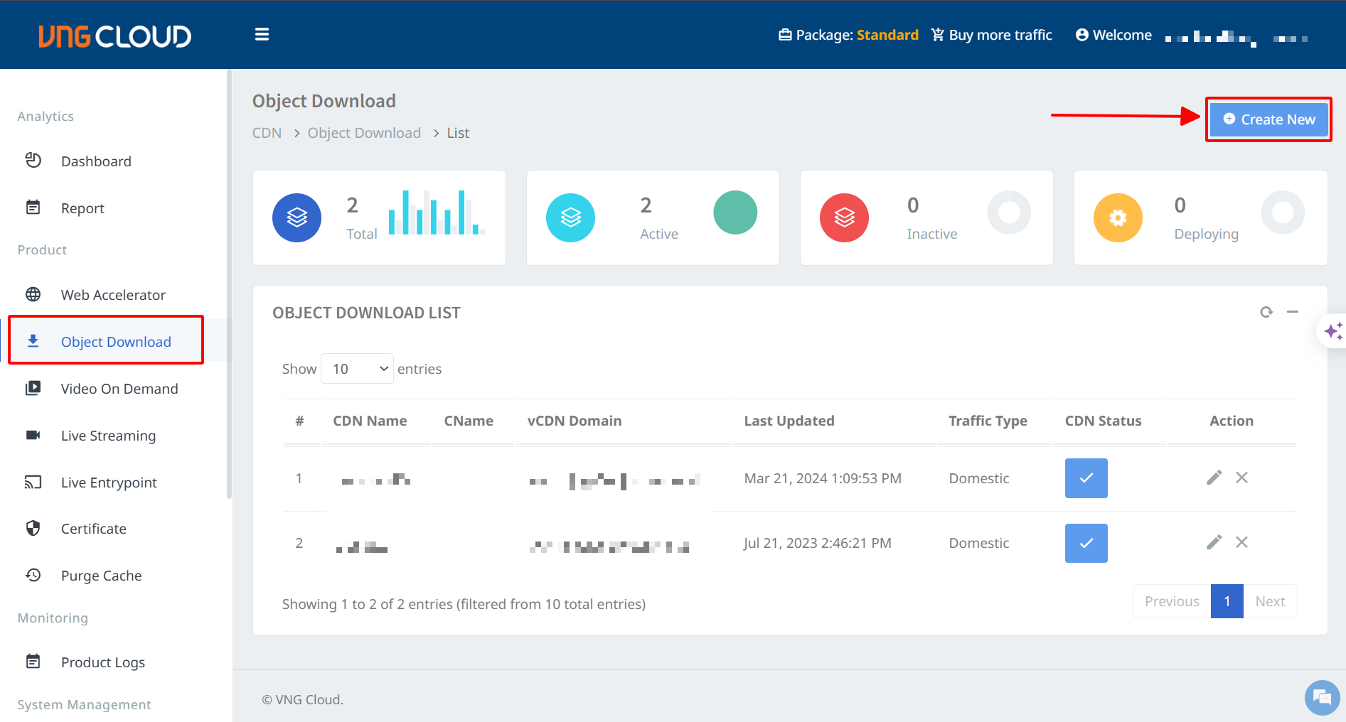 2. Chọn mục **Object Download**, sau đó chọn **Create new.**