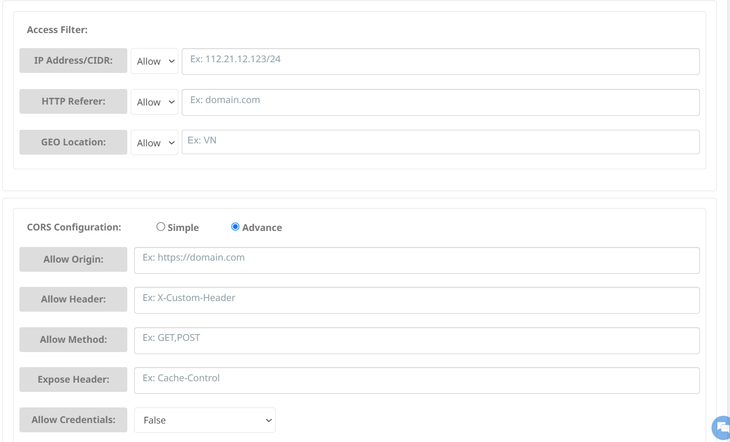 * **HTTP Referer**: Giới hạn cho phép/ từ chối truy cập từ các website cụ thể bằng cách chọn **Allow/ Block** và nhập domain tương ứng.