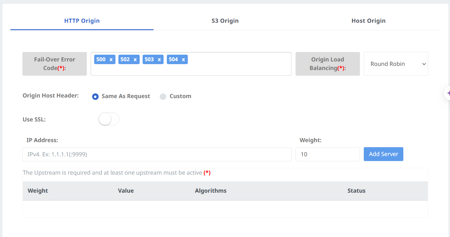 * **Fail-Over Error Code:** Danh sách các mã lỗi HTTP (ví dụ: 500, 502, 503, 504) mà nếu xảy ra sẽ kích hoạt chuyển đổi dự phòng (fail-over) đến Origin khác.