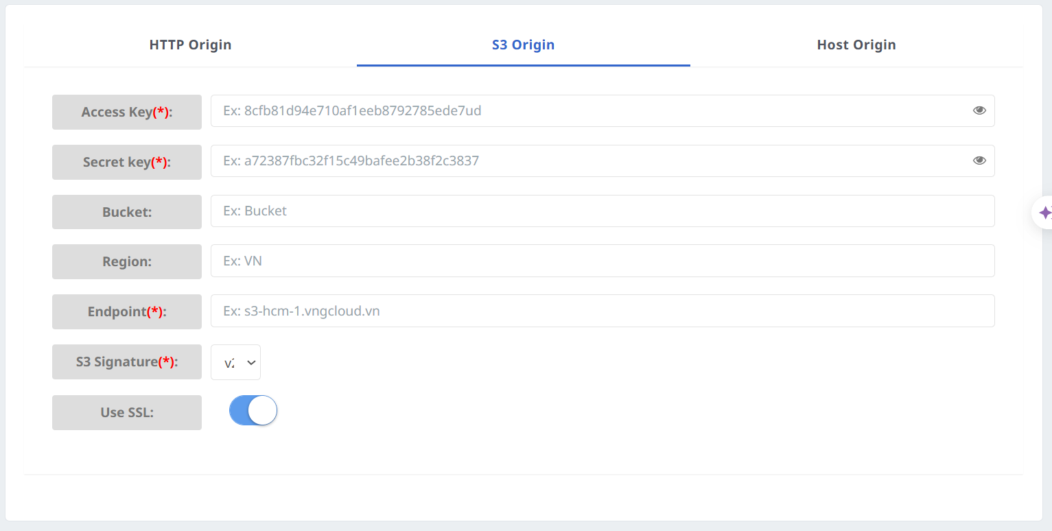 * **Hỗ trợ kết nối trực tiếp đến Origin:** Hệ thống vCDN hỗ trợ kết nối trực tiếp đến các nguồn dữ liệu dạng Object Storage sử dụng chuẩn giao thức S3-compatible. Điều này giúp khách hàng dễ dàng tích hợp dữ liệu từ các dịch vụ lưu trữ đám mây phổ biến hoặc từ vStorage.