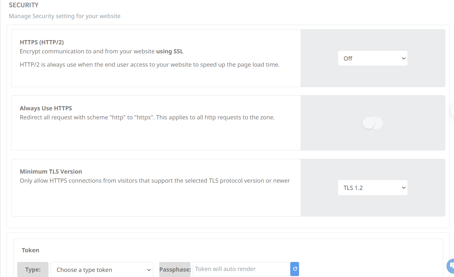 * **Always Use HTTPS:** Bật hoặc tắt tính năng tự động chuyển hướng tất cả các yêu cầu HTTP sang HTTPS nhằm tăng cường bảo mật và cải thiện trải nghiệm người dùng.