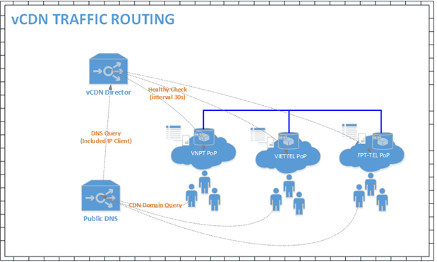vCDN Request Router là hệ thống điều phối tải thông qua dịch vụ DNS của vCDN. Cứ định kỳ 30s, vCDN Request Router sẽ kiểm tra tình trạng sức khỏe của tất cả các server Edge trong mạng lưới CDN bao gồm ở tất cả các ISP khác nhau. Việc này sẽ giúp cho vCDN Request Router nằm bắt được trạng thái của các server Edge gần như tức thời nhằm loại bỏ các server bị lỗi ra khỏi mạng lưới phục vụ sớm nhất và điều phối traffic của server đang bị lỗi sang các server khác. Khi user cần truy cập tài nguyên trên hệ thống CDN thì user sẽ request đến các Public DNS như Google, Cloudflare, OpenDNS hay các DNS Server local của ISP mà user đang hòa mạng. Các server Public DNS sẽ chuyển tiếp yêu cầu đến server vCDN Request Router. Với các thông tin có được tài thời điểm nhận request như: