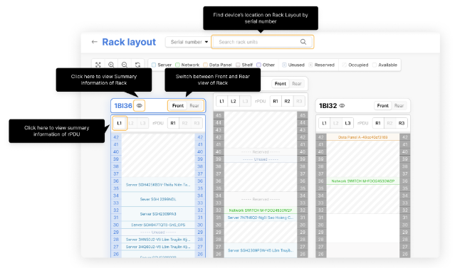 Bạn có thể dễ dàng xác định vị trí của thiết bị trên tủ rack bằng cách sử dụng tính năng tìm kiếm theo Serial number của thiết bị