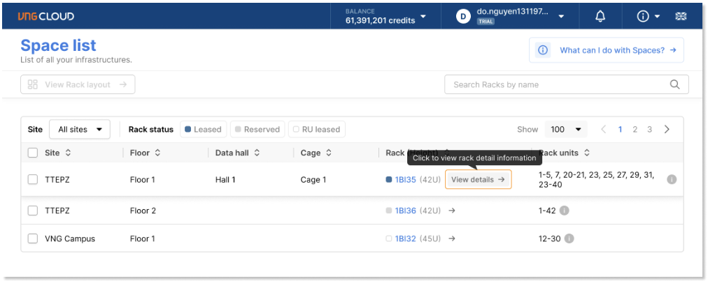 Bằng cách nhấn nút “**View detail**“ trên mỗi dòng của **Space list**, bạn có thể xem thông tin chi tiết của tủ rack.