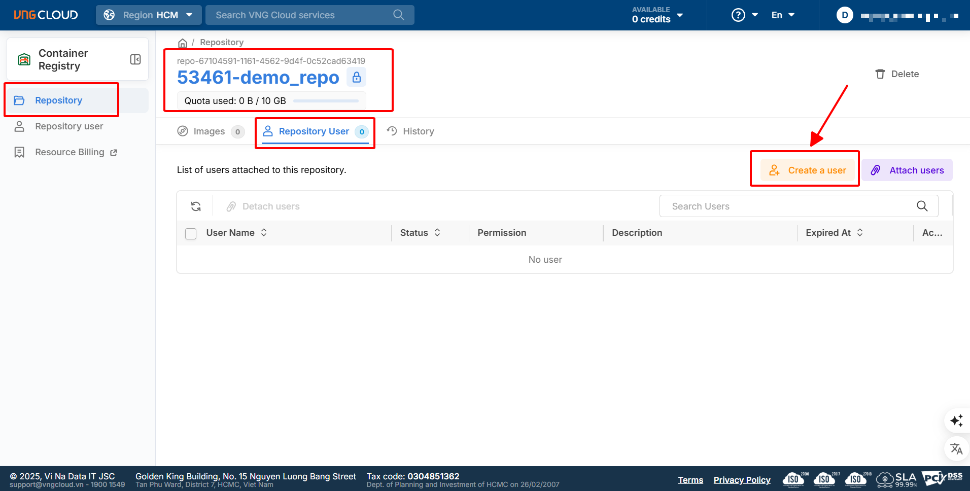 Với Region HAN: https://han-1.console.vngcloud.vn/vcr/repository/list