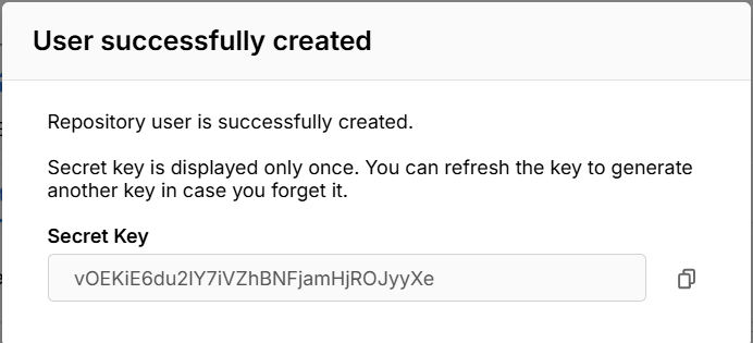 Lấy thông tin Username và Secret key của Repository User vừa tạo.