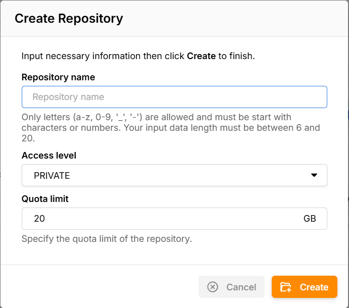Bước 3: Thực hiện nhập Repository name, Access level và Quota Limit tùy theo nhu cầu của bạn.